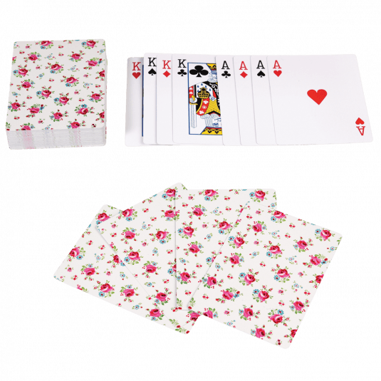 • Cartas de baralho com verso floral em branco e rosa e cartas frente mostrando reis e ases