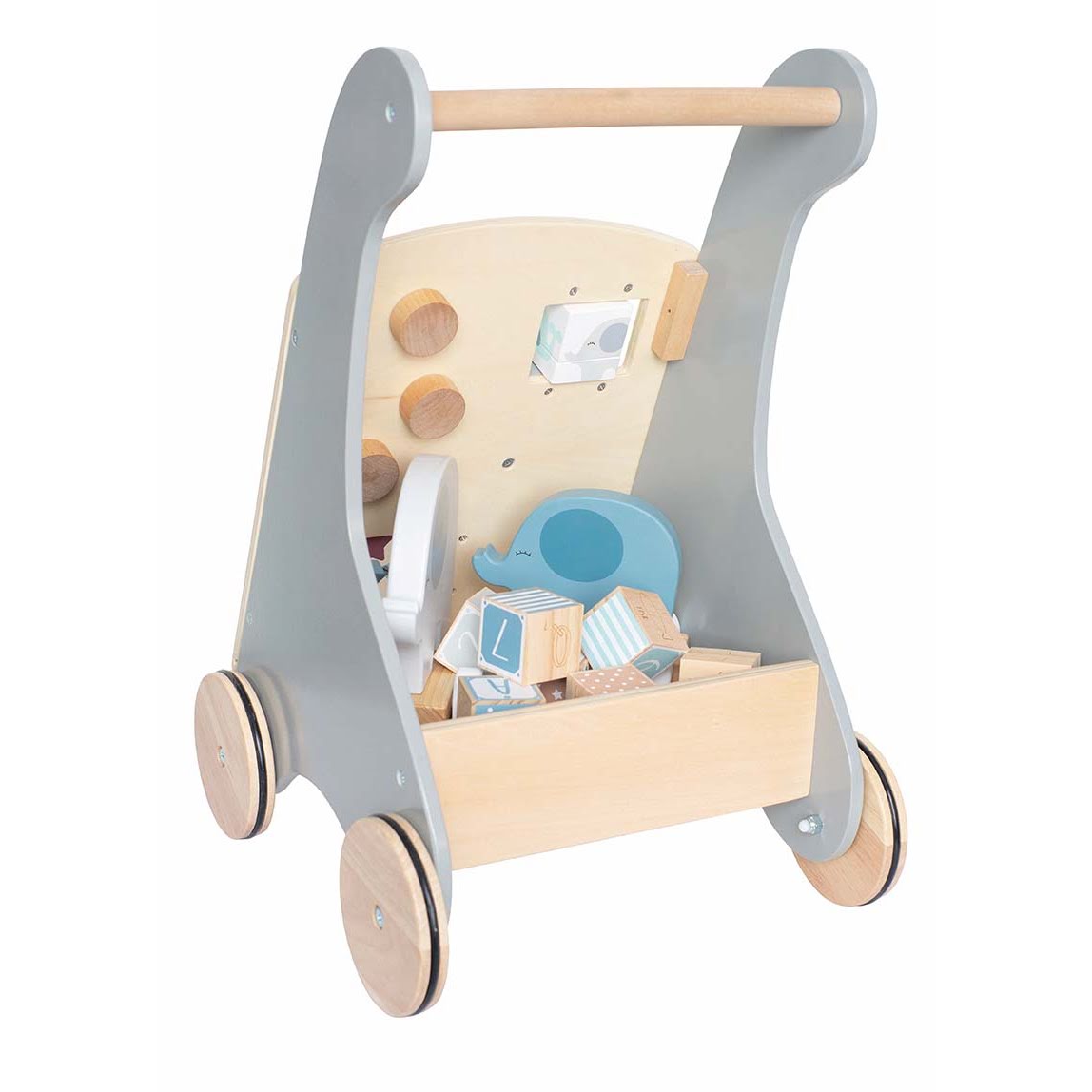 • Carrinho de brinquedo de madeira cinzenta com atividades coloridas e criança a brincar