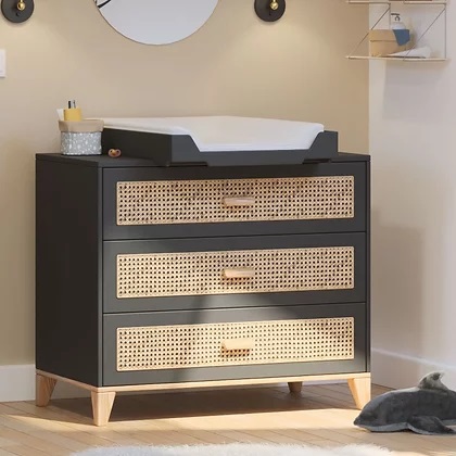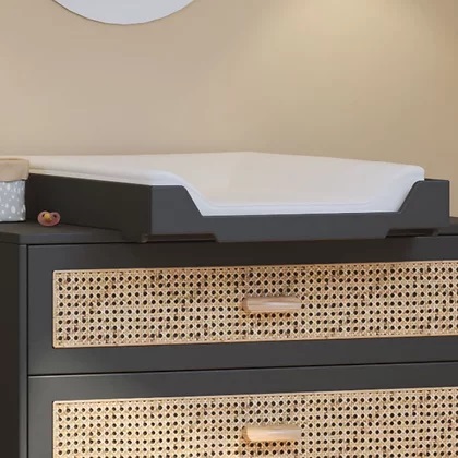 • Trocador de bebé branco em cómoda cinzenta com gavetas de rattan