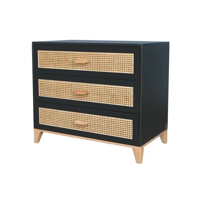 • Cómoda preta com 3 gavetas de palhinha natural e puxadores em madeira clara.