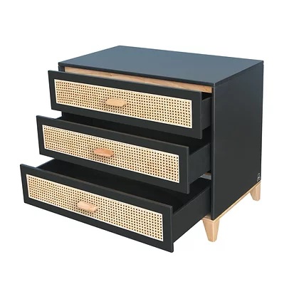 Com três gavetas grandes, esta cómoda oferece-lhe um espaço de armazenamento confortável. Possui corrediças de fechamento suave, seus puxadores e pés são em madeira maciça exposta (cedro branco), e as frentes das gavetas são em rattan.