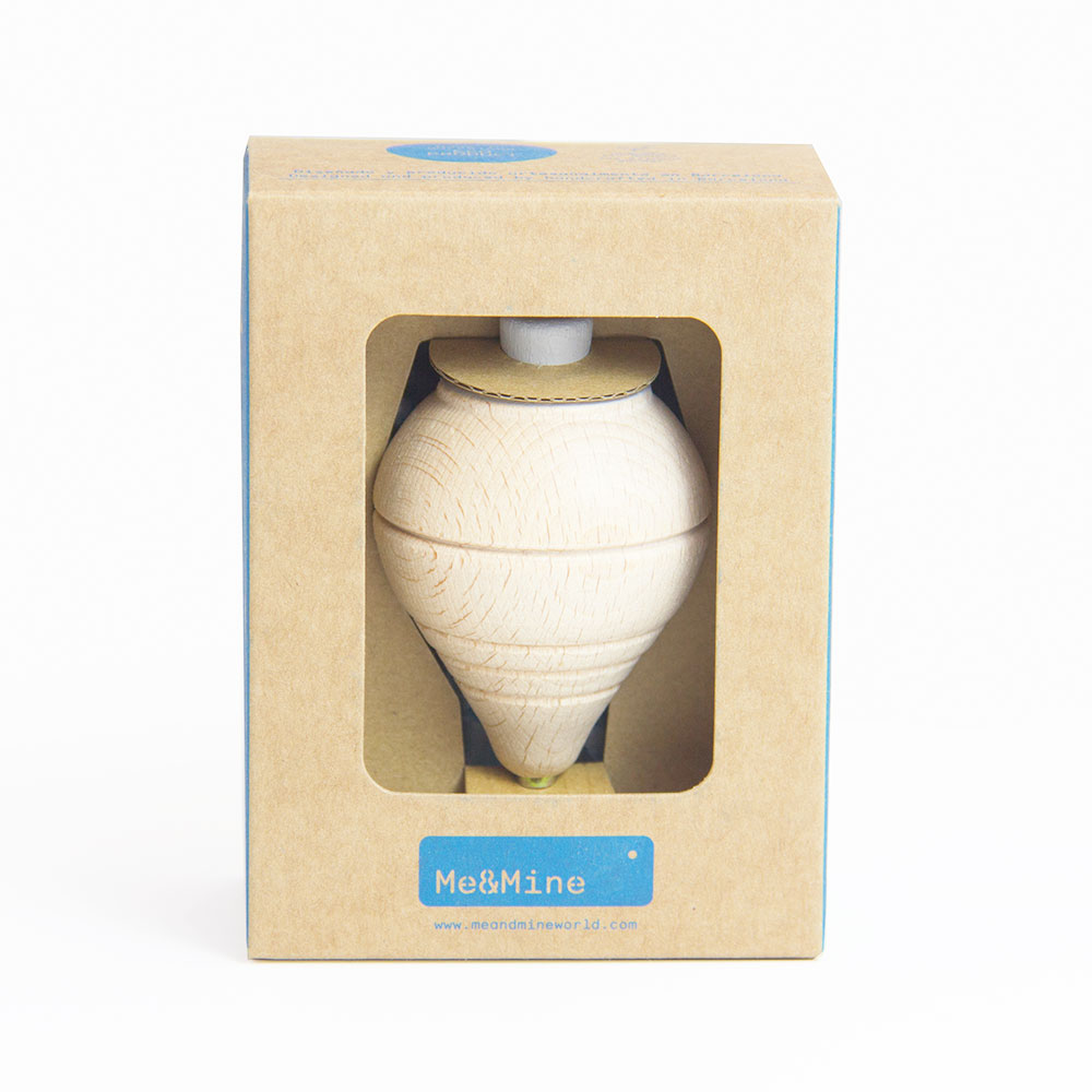 • Pião de madeira natural numa caixa de cartão com etiqueta azul Me&Mine