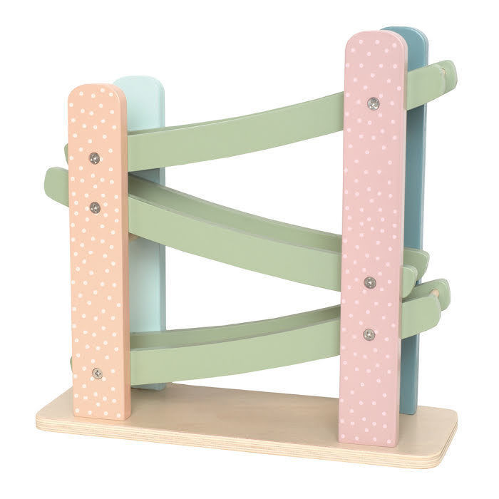 • Brinquedo de madeira colorido com rampas e pontos brancos