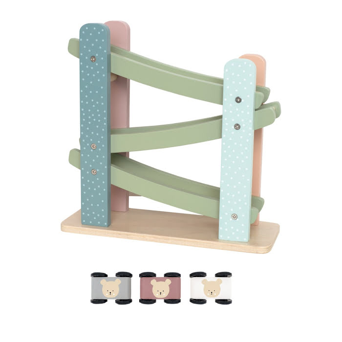• Brinquedo de pista de carrinhos em madeira com três carrinhos de ursos